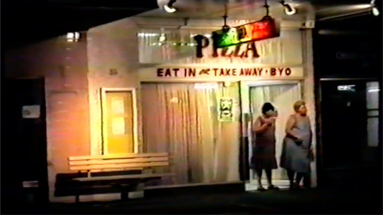 Image: Still from archival video taken by Tom Pence in 1991 – L-R: Amanda Evans, John Bonner, Luke Bourke, Ann Martin, and in front Star Cafe audience member
